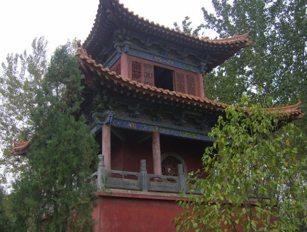 左右两侧是钟楼与鼓楼,另有碑刻数通,有的文字已模糊不清了,看来是年代久远。上了鼓楼,全寺大貌尽收眼底,重重叠叠的楼阁显示出负图寺的幽深,偶然发现下面的花圃也被修成八卦图的样子,很是奇特。