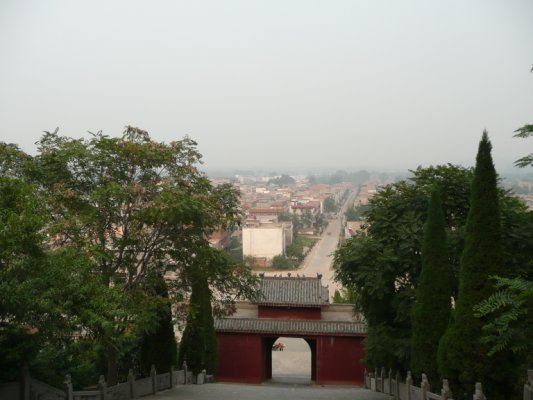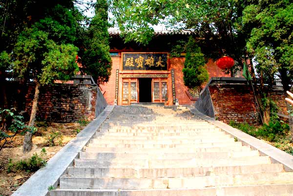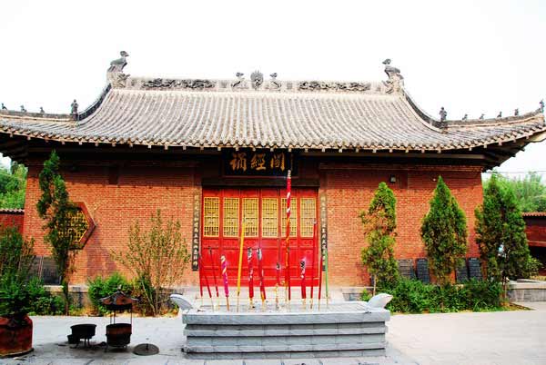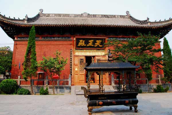 新寺为龙门山色锦上添花:混凝土大道由洛龙路直通寺前。垂直高31米的寺前山坡上,砌着199级宽达10米的石阶,衬托得寺院雄伟壮观,气势不凡。寺内建筑全部为仿清式,青瓦红砖,沿中轴线依次为五间大的二层高山门、天王殿、伽蓝殿、三藏殿、地藏殿,统为飞檐高桃的歇山顶,画栋绘梁,古色古香。