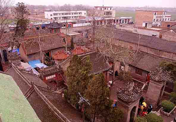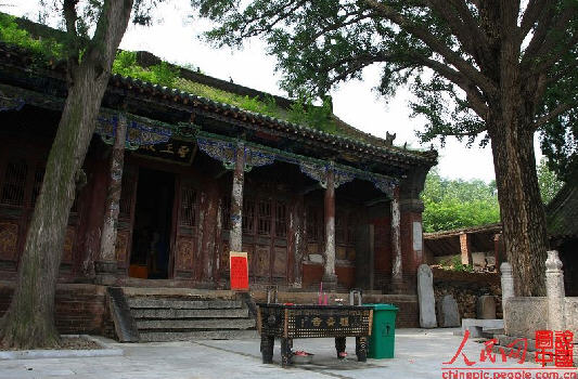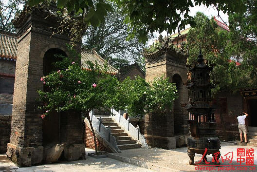 山门面阔三间,进深二间,硬山顶,屋面覆盖灰色板瓦。当年两侧站立着“哼”、“哈”二金刚守门大将军,走进山门,迎面是“天王殿”,面阔三间,进深二间,硬山顶,上覆以板瓦,屋顶正脊中央立一小型殿宇,供奉着天王李靖,四条垂脊之上饰各种小兽。殿外四角建四座碑亭均为小歇山顶,亭内立石碑四通,碑楼上方成弧形建筑饰以浮雕、多刻人物故事。殿西侧有一钟楼上半部四条石柱擎起,歇山顶,平面呈方形,灰筒瓦盖顶琉璃加边,四角各挂一铜钟,微风吹拂激宕作声。进入月宫门正中即是护法神关圣殿,面阔三间,进深一间,硬山顶,灰筒瓦覆顶绿琉璃镶边。殿内东西两壁保存有二幅清代壁画,构图严谨,人物形象栩栩如生,是我省难得的珍品。殿南是月台,台下东西有两座碑亭皆为小歇山顶,灰瓦覆盖,亭内立有明朝弘治十五年雕刻的形碑座的大石碑,碑文是菘山大少林祖庭挽学古梅所撰,京都僧禄司右讲经禅林王堂额。月台左角立有一佛顶。