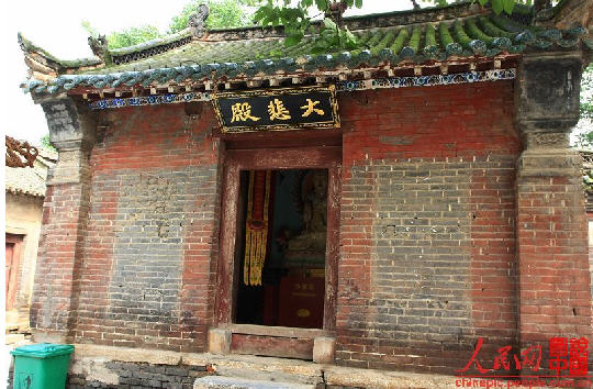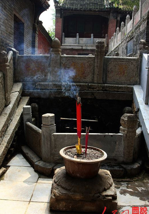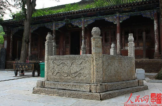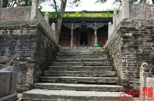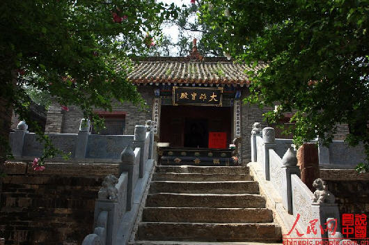 月台是该寺院中的主体建筑大雄宝殿,她面阔三间,进深二间,硬山式,灰筒瓦顶,琉璃嵌边,正脊中央置一琉璃彩狮,高一米。四角四根铁绳牵控,两端龙头大物,流云起脊,殿四角各有庞涓、罗成、韩信、秦桧四个绝人。“大雄宝殿”后即是“升圣桥”,桥西有“迎旭阁”或曰“观间阁”,桥东有“横霞阁”或曰“明目阁”,桥下泉水淙淙,泠泠韵声,桥上各置青石栏杆,雄狮、仙桃各踞其上,雕刻玲珑,形态逼真。桥之东西各有一池、一洞,名曰“东西汤王池”,西者为“水帘洞”东者为“成佛洞”。两洞皆为大青石板成弧形砌成,进洞封门,幽邃寂静与外界万籁隔绝,是修道开悟之宝门。