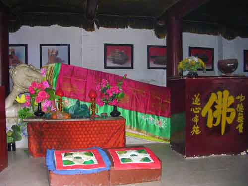 二佛殿系硬山式建筑,单檐筒瓦,大脊三间,殿中供有韦驮和十八罗汉,两侧各有廊房。大雄宝殿面阔三间,进深二间,单檐歇山顶,殿内供奉如来佛祖,是和尚参禅诵经地方,殿前建有宽广月台,左有各自廊房12间,殿中所有构件均用各种色调绘画。法堂系单檐硬山五脊楼房3间,楼上有栏杆,檐下有雕板,殿中为过厅,旗幡仪丈,庄严肃穆。所有之明柱,不加彩饰,给人一种“清静虚无”之感觉;东西两壁灰塑的五百罗汉,造型逼真,惟妙惟肖,各具情态,迎人欲语。充分显示了我国古代劳动人民的精湛艺术才华。