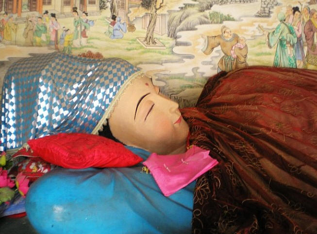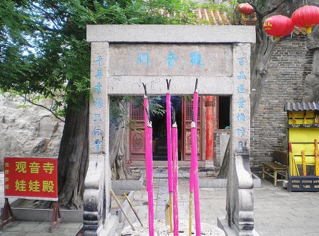 又名娃娃殿,在龙洞西,是大伾山上最北端一处古建筑。殿坐南向北,院内古柏参天。迎面山岩如屏,高数仞,上刻“观音岩”,岩下依岩建拜厦三间,卷棚顶、槅扇门,小巧别致。殿内依崖凿洞,内供观音菩萨,傍侍金童玉女。殿始建于元代,浚州知州刘友谅于此向观音求雨有应而于崖壁刻观音画像,因名观音岩。后于岩下凿洞雕像。本为求雨而凿观音大士,后逐渐变为送子观音,成为善男信女求子圣地,每年正月与八月古会期间,求子、还愿者络绎不绝。院内求子有应碑随处可见。东侧有陪房三间,西侧有两间,为僧人居所