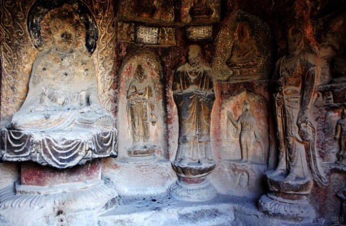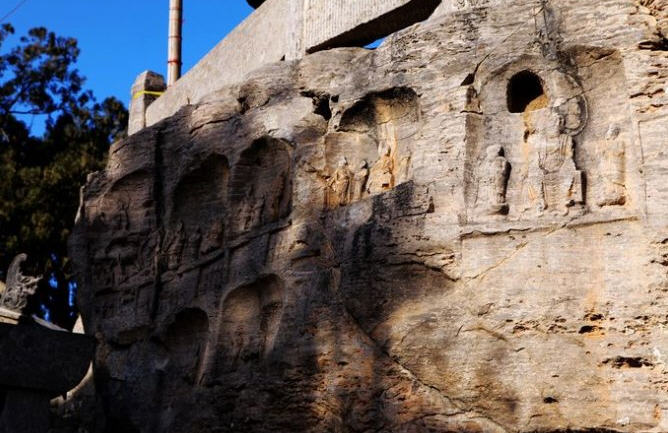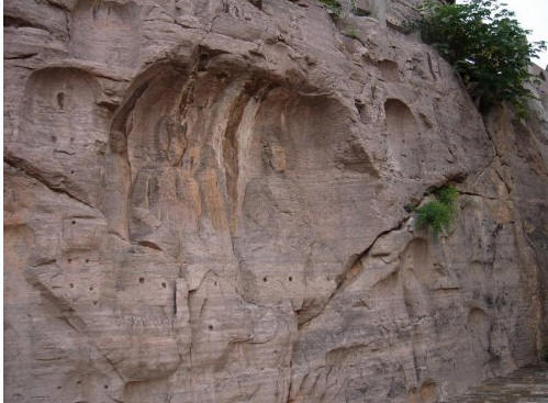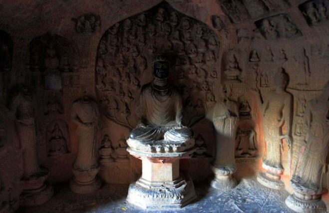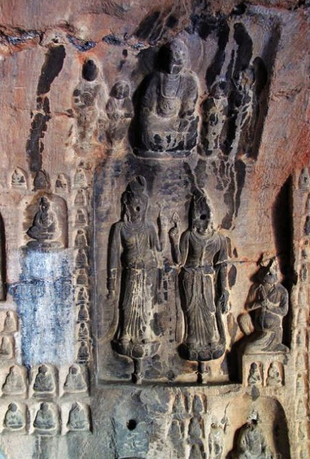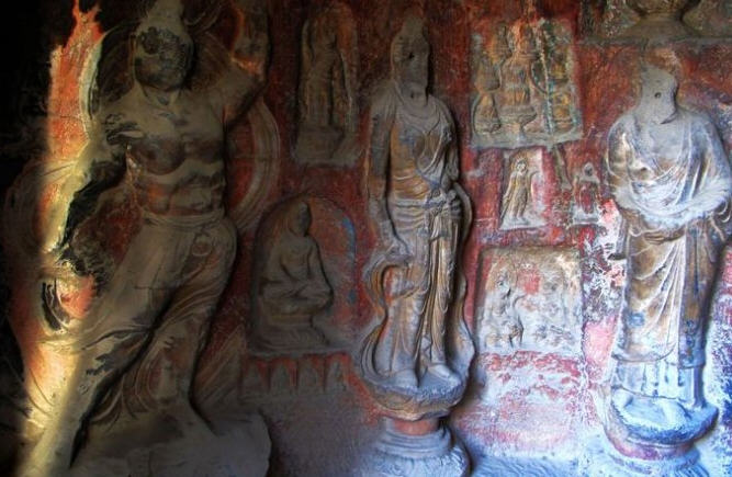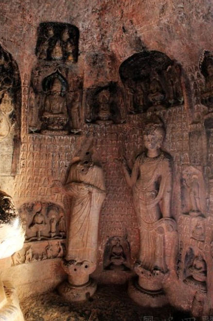 西南崖壁上,亦尽是大小佛龛、佛像。可惜的是,这些洞窟内外的石刻雕像经过千年风雨剥蚀以及人为破坏,如今多半残缺无首。
