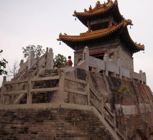 倘若您登上浮丘山上碧霞宫后院的寝宫楼,站在环廊的西北角凭栏而望,千佛寺全景便尽收眼底。寺内一座拔地而起的山岩更是引人注目。这座孤岩,远看恰如湖面的一叶扁舟。这就是“山上山”的奇特景观。著名的千佛洞石窟就雕凿在这“山上山”上。