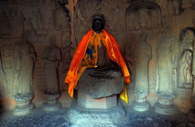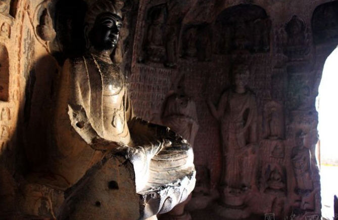 阳光从洞口渐渐转入洞中,仿佛让人看到光阴流转中沧桑巨变的图景。手拂过斑驳残缺的石刻雕像,夕阳下人们怀古探幽的身影正如长长的慨叹,倒映在似水的光阴中。