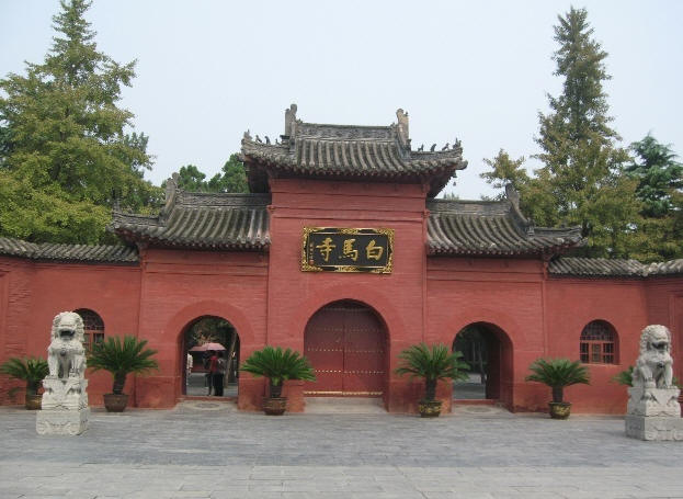 白马寺位于洛阳市东12公里,北依邙山,南近洛水,是中国佛教的发源地。创建于东汉永平十一年(68),迄今已历一千九百余年的岁月。据记载:东汉永平年间的一天夜里,汉明帝刘庄做了一个奇异的梦,梦见一位神异的金人。那金人身高六丈,背项发光,从空中飞行而来。明帝不知此梦是吉是凶,第二天便询问众臣。一位叫傅毅的大臣叩首答道:梦见的金人是天竺圣人。于是永平七年(64)汉明帝派遣蔡谙、秦景、王遵等十多人由洛阳出发,前往天竺国寻求佛法。这十多位西行求法者过天山、越葱岭,辗转来到今阿富汗一带的古大月氏国。在那里,他们巧遇印度高僧摄摩腾和竺法兰。乃同腾、兰以白马驮载佛经佛像于永平十年(67)返回中土。第二年汉明帝下令在洛阳城雍门(正西门)外,根据天竺佛寺式样,建造了中国第一座寺院。鉴于佛经佛像由白马驮载而来,遂以白马寺为名。