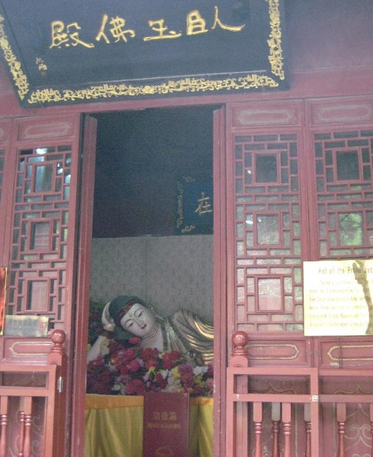 大佛殿之后,是一座悬山式建筑“大雄宝殿”。它长22.8米,宽14.2米。殿前有一月台,是寺院内最大的殿宇。由歇山顶改为悬山顶,面积有所缩小。殿内贴金雕花的大佛龛内塑的是三世佛:中为婆娑世界的释迦牟尼佛,左为东方净琉璃世界的药师佛,右为西方极乐世界的阿弥陀佛。三尊佛像前,站着韦驮、韦力两位护法天将的塑像,执持法器。两侧排列十八尊神态各异、眉目俊朗的罗汉塑像。这十八罗汉都是用漆、麻、丝、绸在泥胎上层层裱裹,然后揭出泥胎,制成塑像,这种“脱胎漆”工艺叫夹苎干漆工艺,在国内是独一无二的,乃寺中塑像之精品。背后殿壁上还排列整齐地刻镂着五千余尊微型佛像。
