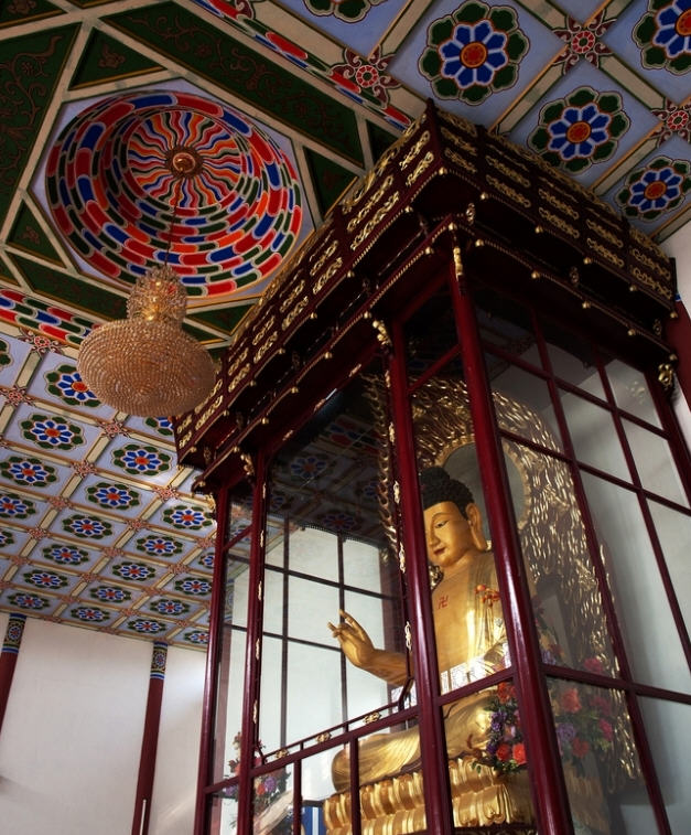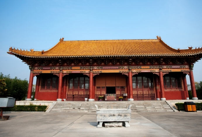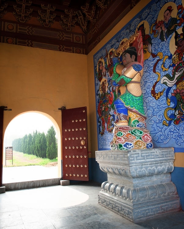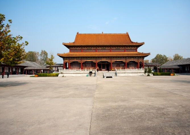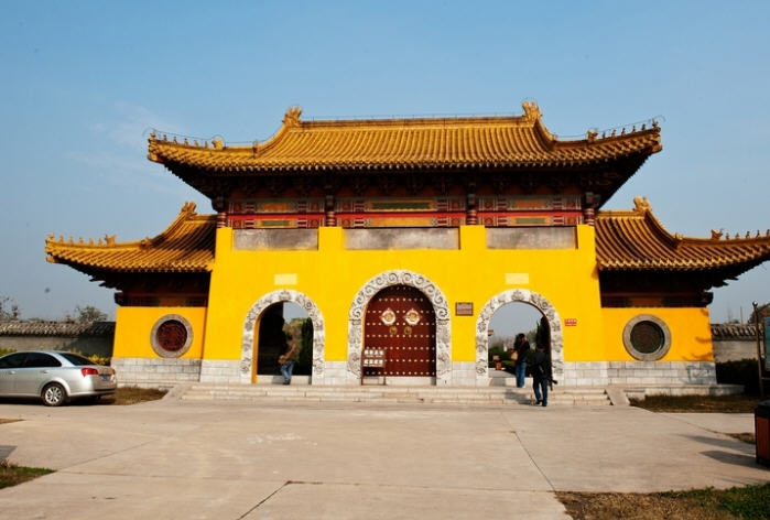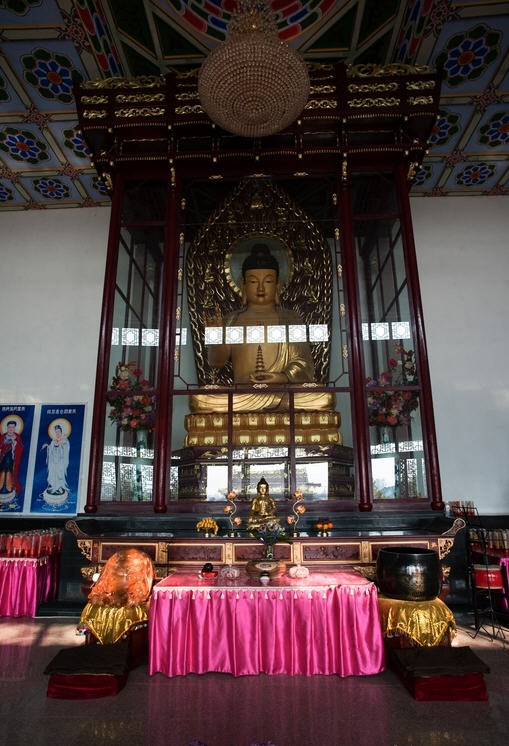 5.大雄宝殿:大雄宝殿是圆融禅寺的主体建筑,为九间回廊重檐庑殿式建筑,长55米,进深30米,殿高30米。殿下筑有三层汉白玉月台,每层1.5米,月台共4.5米高。其造型与故宫“太和殿”相仿,其规模可与孔庙“大成殿”相媲美。重檐九脊,斗拱交错,雕梁画栋,富丽堂皇。殿内供奉佛祖释伽牟尼及其陪侍24诸天。释伽牟尼像前两边塑有两尊站像,一为伽叶,一为目建连。释伽牟尼背后是海岛观音塑象,并有众多童子相伴。