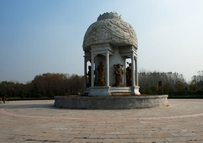 它是在始建于北魏年间的亿城古寺的基础上扩建而成的。战国时期齐国军师孙膑晚年辞官隐居故里研究兵法,修著兵书。威王念其功高,经常派文武官员前来探视,特建驿城以供食宿,孙膑去世后就葬在驿城前。北魏太和年间,禅宗祖师菩提达摩入中原传经,访此古迹,见此处山青水秀人杰地灵,遂嘱弟子将驿城改建为佛教寺院,命名“亿城寺”(取“亿”安静之意)。亿城寺鼎盛时期,“僧众千余人,佛像万余尊”,堪称北方寺院之楷模,当时许多寺院的住持均由此寺选派,实为中国佛教文化发祥地之一。圆融禅寺可再现当年古寺雄姿。整个寺院采用轴线对称以塔为中心的建筑布局,五殿、一塔、一山、一池均座落在中轴线上。由南至北依次是放生池、天王殿、药师殿、佛塔、大雄宝殿、弥陀殿、文殊殿、须弥山。
