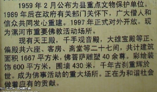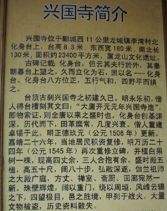 如今,在这座台子上的是一座寺院,名叫兴国寺.它始建隋代,毁于兵火,明嘉靖年重建,寺内有600年龄白果树一株,高4丈余,4人合抱。如今,古老的化身台兴国寺是漯河市唯一对外开放的佛教活动场所。