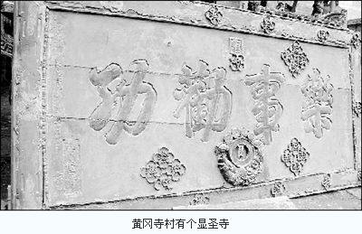 黄岗寺村在嵩山路与南三环交叉口,很容易找到村中间的显圣寺。该寺大雄宝殿门口,放着一通写有“圣旨’二字的碑盖,碑身只剩下三分之一。一侧放着光绪九年(1884年)的碑刻,记载着该寺当时的盛况。寺院初建于唐,原名报恩寺,香火鼎盛。清光绪年间重修显圣寺,用的是村里的树木,寺建成后,整个村落只剩下一片黄土岗。寺原有三进院和大牌坊甬通,但现在只剩一个小院,殿内有如来佛祖和关公。