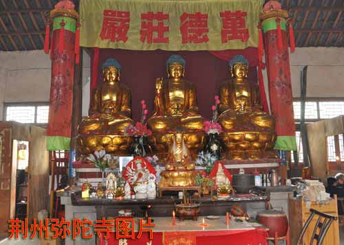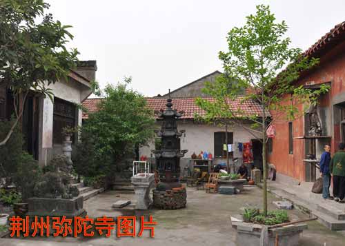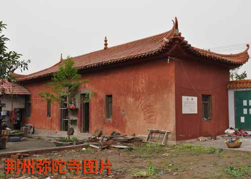 弥陀寺位于荆州城南十二里(现荆州区弥市镇炮台村),肇建自唐贞观元年,有所谓“未有弥市,先有弥陀”之说。元大德五年(公元1301年)由德正和尚重建。明、清两代不断修葺。史料记载,明末清初,法空和尚住持弥陀法务,得到朝野支持,据《江陵县志》记载,“斯时,寺院占地一百有八公顷,为殿者九,为楼者十八,凡四百八十僧舍,巍峨壮观。”名刹赫然,法筵宏开,冠映四海,震耀于世,终不负天地造化之功也!