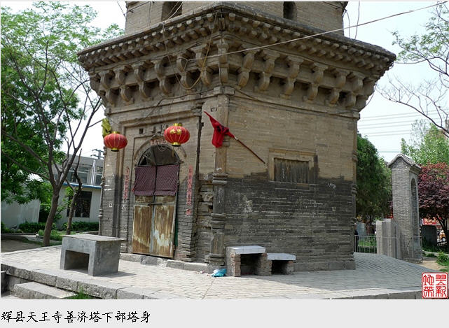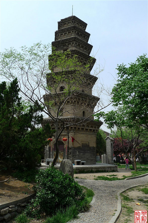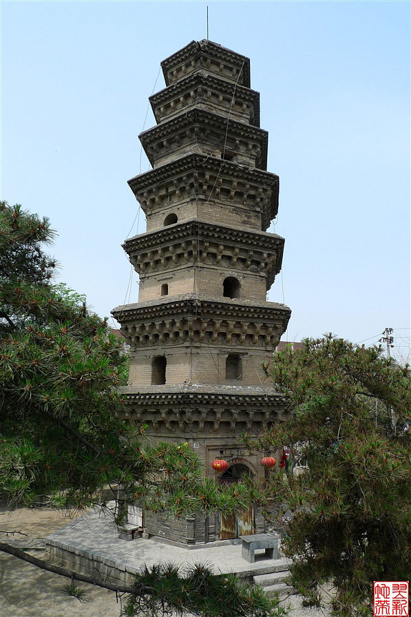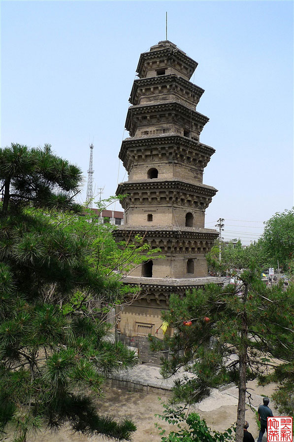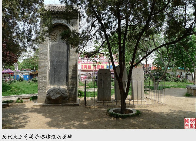 位于城内中心路与塔东街交汇处的东南部,创建于元世祖至元四年(1267),塔址处原有天王寺,已毁,现仅存砖塔一座。由塔基、塔身和塔刹三部分组成,为七级六角形阁楼式砖塔,高24.4米。塔基为六角形须弥座,塔身由下而上逐层收敛,呈锥形,通体嵌砌青砖浮雕。特别是第四层外壁上砌一层佛像雕砖。每层顶部砖檐外露硕大的砖雕斗拱、额枋和飞檐椽头。塔身第一层有砖雕楼柱,东壁辟一塔门,左右开两个砖雕假窗。进入塔门即为塔心室,室顶为砖砌叠涩顶,设梯可绕塔逐层而上。以上各层皆辟塔门,可供游人远眺。第七层顶部有一天门。塔顶之塔刹原有覆盆、相轮、铁插杆。塔为仿宋建筑,同时又吸收喇嘛塔建筑艺术,为研究元代建筑艺术和佛教历史的珍贵实物资料。塔与附近石碑,均为省级重点文物保护单位。