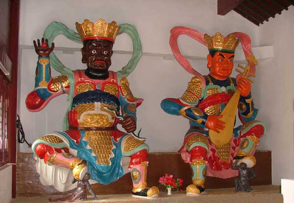 殿内三尊大佛顶天立地,形象庄严、内质香樟、外饰纯金。雕塑工艺巧夺天工,刻划形心出神入化。玉雕观音、悲容显露。文殊驱狮,天慈普履。普贤飞象,珠幡拂空。金容掩色,不镜三千之光;丽象开图,空端四八之相。绮罗精美而光摇屏动;莲灯秀巧而云拂翠华流。满殿法器皆精品,全寺香案均上乘。雕梁画栋工艺精湛,刻龙浮云玉栏曲砌。整个寺院堪称玲珑莲境,德仪法坛。