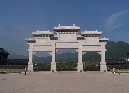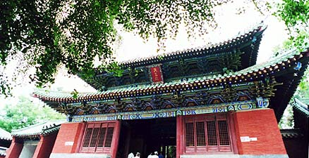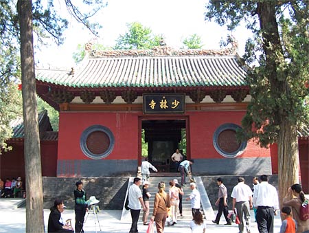山门,应作“三门”。依佛经言,三门即三解脱门简称,称寺院大门为三门,取其入道之义。现少林寺三门,系清雍正十三年(公元1735年)敕修时所建。1974年重修。正门上方横悬长方形黑底金字匾额,上书“少林寺”三字,康熙四十三年(公元1704年)御题颁赐。三门殿内神龛供奉弥勒坐像。神龛后面为韦驮立像。三门前有石狮一对,竖眉鼓目,纯真威武;雕工精致,元明旧物。三门的八字墙外,有明嘉靖年间建立的石坊两座,东西对称,形制相同。