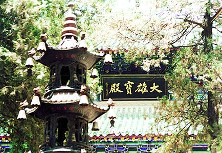 大雄宝殿,是寺院佛事活动的中心场所。原建筑毁于一九二八年,一九八六年重建。殿内供释迦牟尼、药师佛、阿弥陀佛。上悬挂清康熙御书"宝树芳莲"。屏墙后壁悬塑观音像。两侧塑有十八罗汉像。