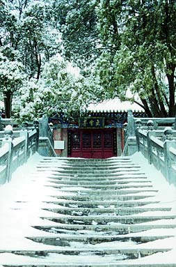 立雪亭,在方丈室后,为纪念达摩慧可而修建于明正德七年(公元1512年),殿内供初祖达摩。神龛上方悬挂“雪印心珠”匾额,系清高宗弘历帝游幸少林时御题,匾额正中钤“乾隆御笔之宝”印鉴。神龛后奉紧那罗,铁铸,造型古朴有力。