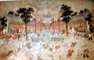 千佛殿,为少林寺最后一进大殿,也是少林寺现存最大的佛殿。因殿内绘有大型壁画五百罗汉而得名。殿内供毗卢佛,故又称毗卢阁。神龛后面北壁及东、西两壁,绘“五百罗汉朝毗卢”大型壁画:壁画高七米五,长四十二米,面积约三百二十平方米,构图严谨,形象生动,气势磅礴,世所罕见。殿内地面上,尚有四十八个脚坑,传当年寺内武僧练武所遗。清代朝廷禁止民间习武,少林武僧只好选择最隐蔽空旷的千佛殿习武。