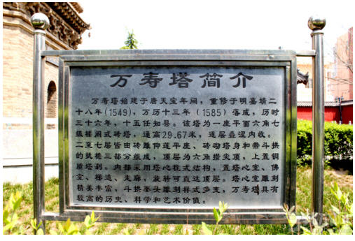 万寿塔高28.4米,底层周长23.1米,自下而上每层高度及直径稍有减少,但无明显锥体感。塔的建筑风格有深厚的阁楼色彩。每层顶部都有青砖雕砌的阁楼飞檐,檐下六面墙,每面都有一个圆顶拱券楼门,飞檐伸出墙外约二尺多宽,精雕细刻,构思巧妙。飞檐所雕图案花样又分三层,每层厚约三十多公分。下层为砖雕斗拱,中层为磨砖仿椽头及飞檐,上层为砖磨莲花瓣,层次分明,牢固美观,是古代叠涩雕彻的上乘工艺。塔的用料,除塔基垒彻一米高的石条外,其余全是青砖彻成。塔体结构分内中外三层。内层是一锥形空心圆柱;外层为里圆,外呈六角形;中间层为半实半虚的螺旋式登塔阶梯和通道。塔的最高层,中心放了个大木柱,至顶部改为铜刹和塔尖葫芦连成一体。各层内壁均嵌有塔铭,所写诗文大多为明代绅士登塔观感、抒怀等。
