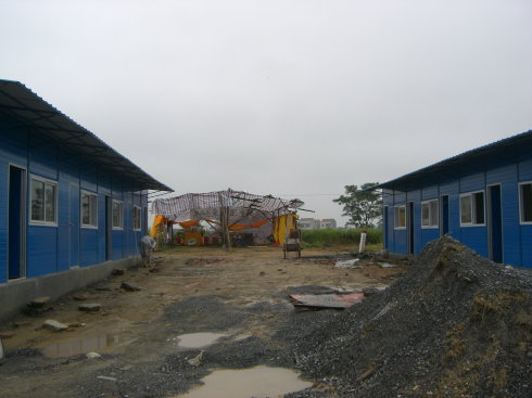 新的石观音寺在路的另一侧。一块刚被整平的场地还没被踩出很清晰的路来,两排蓝色彩钢房座落在刚凝固不久的混凝土基座上。几根木柱搭起的简易棚子遮着弥光老和尚的临时墓塔,供着老和尚的法相。场地的东南方向,立有一尊汉白玉观音像。