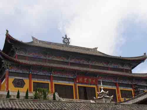 寺院占地面积五十庙,现建筑面积二万余平方米。通过极乐石桥,天王殿、大雄宝殿、弥陀宫(万佛殿)、念佛堂、法堂(藏经阁)等五进主殿和方丈室依山傍势,法轮高耸,飞檐陡峭;南北僧舍三百余间僚房和观音殿、地藏殿、祖师殿、伽蓝殿、延生堂、斋堂(能容七百余僧人同时进餐)、客堂、钟鼓楼等鳞次栉比;山门、露天大佛、流通处、长明灯碑亭、无量寿亭等点缀其间。其建筑特点:主体突出,层次分明,布局协调,错落有致,典雅古朴,主体建筑风格呈仿宋特色。