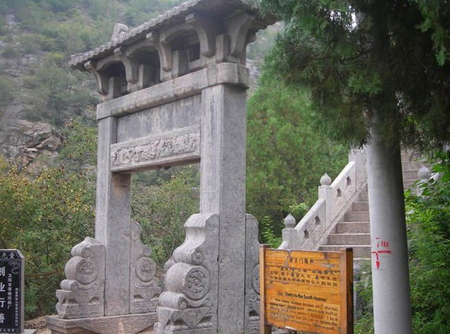 “南天门”又称“淑海香天”石坊,建于崇贞九年。是明末进士孙征澜为迎奉观世音大殿而捐建。左右刻有“西天既许分东土,南海当移住北方”的对联,横批 “淑海香天”,意思是“既然西方的佛教文化可以传到东方来,那南海观世音菩萨为何不可以住下座北朝南的大殿呢?”所以香泉寺就有了全国唯一一座坐北朝南的观世音大殿。