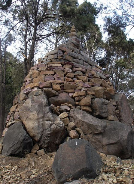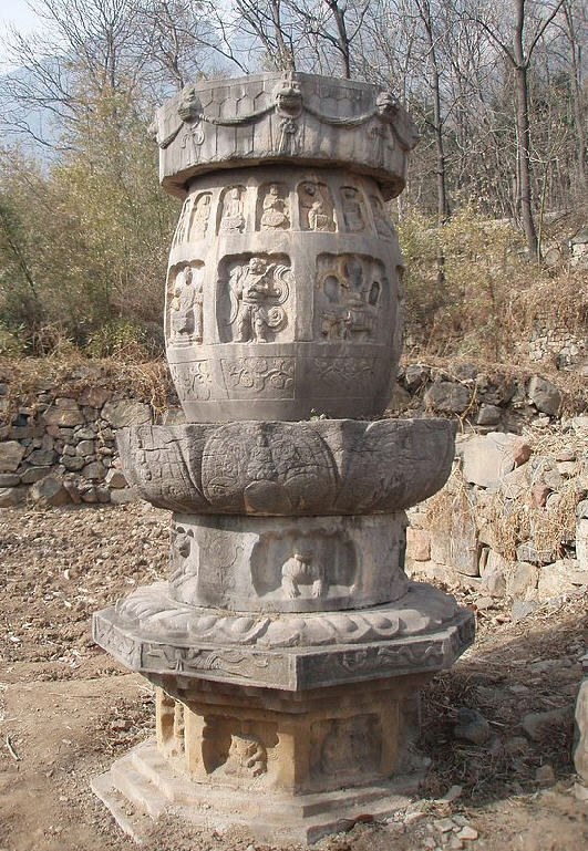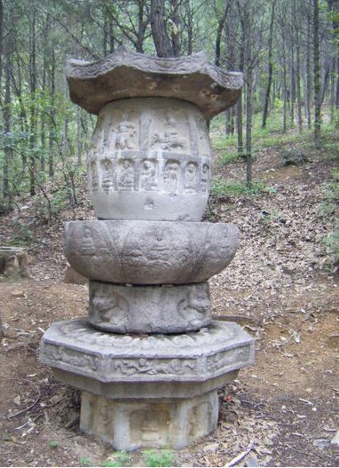 佛心妙觉大禅师石塔:位于普照大禅师石塔东50米处。纯石结构,喇嘛塔。五层,塔顶部分构件已缺损,现存高度为3.71米。下部为双层须弥座构成的塔基。塔基下层为八角形须弥座。上枋每面各雕一个不露双足的供养飞天,形状或为拍钹,或为吹笙。束腰部分每面刻一壶门,内雕伎乐人,各操笙、笛、排箫、筝、竖琴、箜篌、腰鼓等。上层须弥座的束腰每面刻四个壶门,内刻一蹲狮,显露前半身。下枭刻覆莲一周,上枋、上枭刻单瓣仰莲二层,每层八瓣,上层每朵莲瓣中各刻一尊佛像,均有头光,结跏趺坐于莲座之上,呈禅定像。塔身鼓形,高0.90米。分上下三层雕刻。下层刻八组不同姿态的牡丹花。中层置八个佛龛。北龛内为一佛二菩萨,本尊和右胁侍菩萨已残毁。南龛内雕一佛二弟子;东南龛雕一跣足武士;西南龛雕一持剑力士;东龛内雕骑象的文殊菩萨;西龛内雕骑狮的普贤菩萨;东北龛内雕一力士;西北龛内雕菩萨一尊。上层置佛龛十六个,龛高0.18米。每龛一佛,结跏趺坐于须弥座或方形台座上,手持之物或禅杖,或经卷,或净瓶,或拂子,或摩尼珠等。还有的手执独角兽,有的佛身上卧雄狮。塔身之上为塔脖子,高0.33米,八角形,每角雕一狮首,口衔花绳,颈系彩带。塔脖子上仅存一层八角形塔檐,翼角翘起,刻有动物和花卉图案。檐下塔壁高0.25米。四正面均刻尖拱形佛龛,龛内各刻一佛。刹已不存。