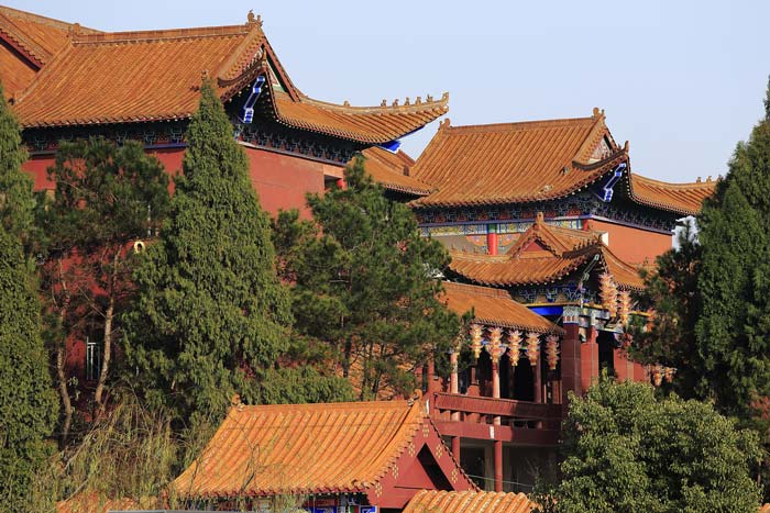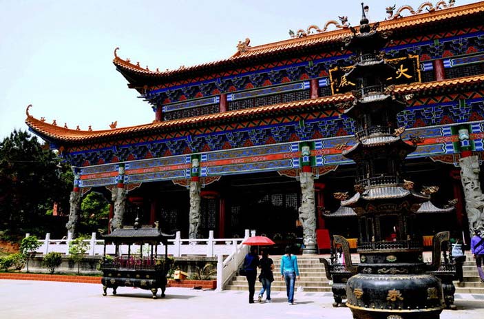 重建的灵泉寺位于龙泉山天马峰南麓,明楚昭王寝西侧,环山拥翠,林泉清幽,风景极美,占地面积130亩,建筑面积1.6万多平方米。寺院整体依山而建,坐北朝南,红墙金顶,煞是壮观,远远望去,重重的楼阁,无尽的庄严,依序而起的建筑有:牌坊、山门、大雄宝殿、天王殿、客堂、上客堂、斋堂、方丈楼、僧寮、财神殿、地神殿、准提阁、龙王阁、素春斋、流通处、居士楼、书画院、放生池等 山门,已初具丛林规模。