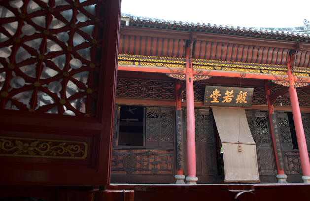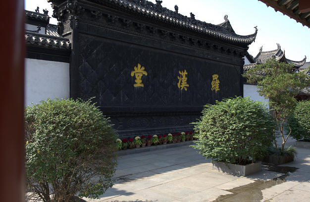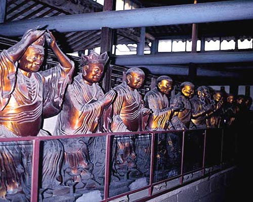 罗汉堂外侧地藏殿内,供奉着地藏像,殿内的木刻神龛更为佳品,其间斗拱飞檐,鱼角搬爪,双凤朝阳,飞龙滚柱,浮雕垂栏,花草人物,均极为精巧玲成,为国内少有的艺术珍品。