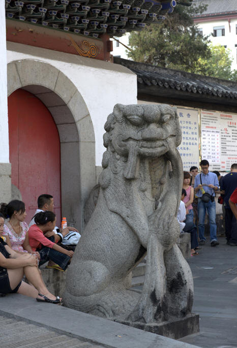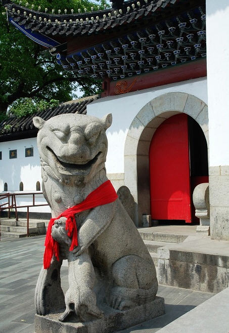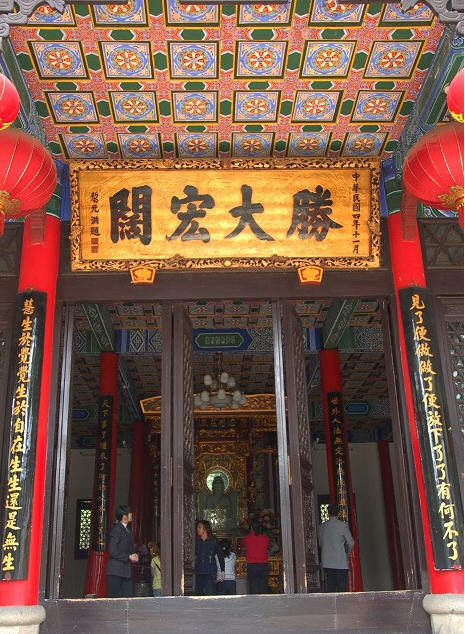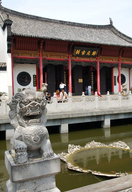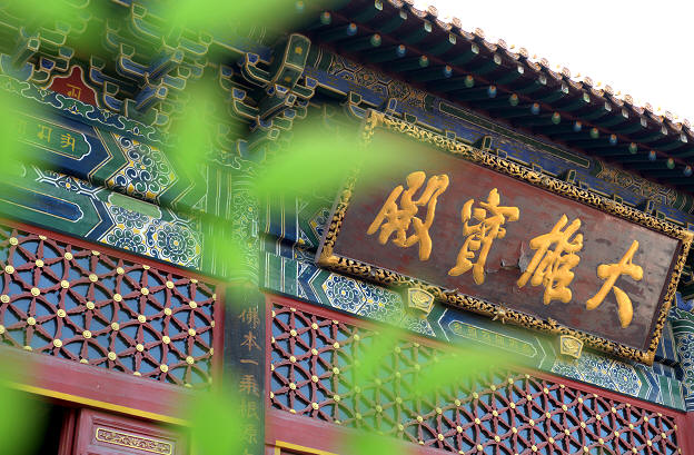 中院的主体建筑是大雄宝殿。该殿初建于清顺治十八年(1661年),后经多次维修。现大雄宝殿是清光绪三十四年(1908年)重修,经过近年来的维修,气势宏伟。大殿正中供奉着释迦牟尼坐像,两侧为其弟子阿难和迦叶,均为托沙雕塑。释迦“偏袒右肩,结跏趺坐”,十分庄严静穆,威仪俨然。佛像后的背光是用樟木雕刻而成的“五龙捧圣”的图案。佛像前还有韦驮、弥勒、地藏像,佛像后是一组海岛观音像,只见海岛观音赤足站在鳌头上,左右侍立着龙女和童子,背后是一面高达八尺的泥塑悬崖峭壁,足下碧波万顷,怒涛汹涌。整个塑像向前倾覆。人们仰视上去,只见观音衣袖似在飘动,正在汹涌的波涛上迎面向你浮来,增加了宗教艺术的感染力。