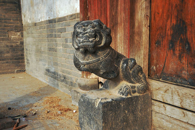 山门正门面阔三间,进深六架椽前后设廊,系明代单檐硬山式木构建筑。正门两侧设掖门。正门前后檐柱头平齐,柱顶石分为三层。棋盘门置于明间老檐柱之间,门枕石上卧一石狮。