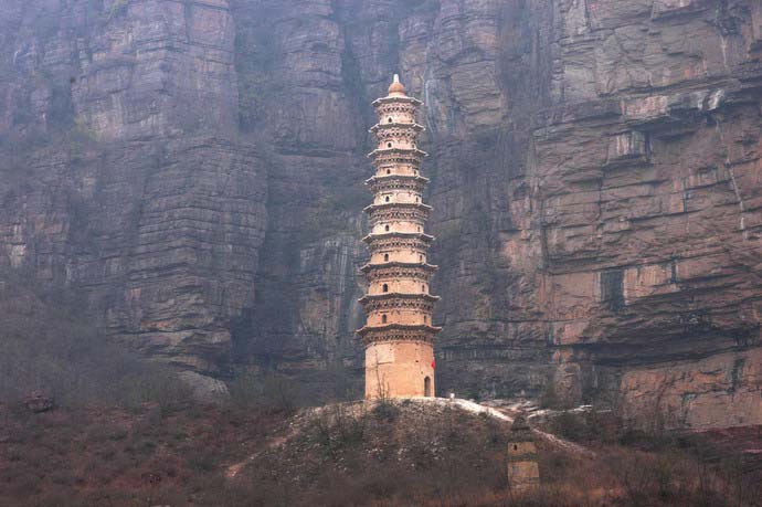 百家岩寺塔,又名“孝女塔”,修建在天门瀑布南部西白涧西岸孝女崖上,是百家岩寺的主要景观建筑物。据清代道光年间《修武县志》记载,唐代武则天时,获嘉县有张氏女,殉身投崖而死,其母朱四娘为她建塔于崖上。据考此塔始建于唐垂拱三年(687年),如意元年(692 年)功毕,重建于金。塔为八角九级楼阁式砖塔,高20余米,塔身每层高度自上而下递减,渐有收分,塔体外形轮廓略呈抛物线形。 2006年5月,百家岩寺塔被国务院公布为第六批全国重点文物保护单位。