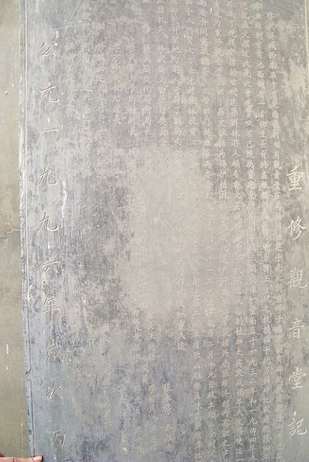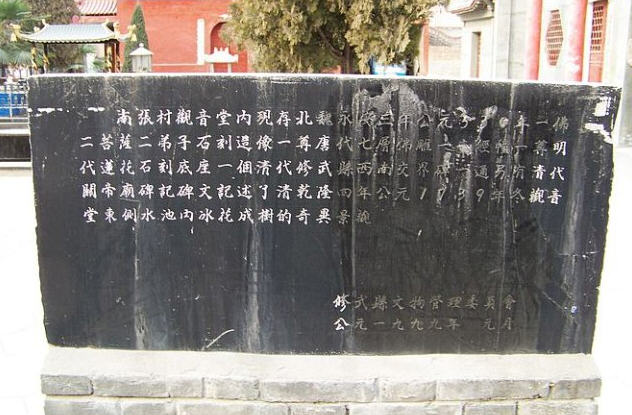 南张村观音堂石刻保护碑内容:南张村观音堂内现存北魏永安三年(公元530年)一佛二菩萨二弟子石刻造像一尊,唐代七层佛雕一座,经幢一尊,明代莲花石刻底座一个,清代修武县西南交界碑一能,另有清代关帝庙碑记,碑文记述了清乾隆四年(公元1739年)冬观音堂东侧水池内冰花成树的奇异景观。
