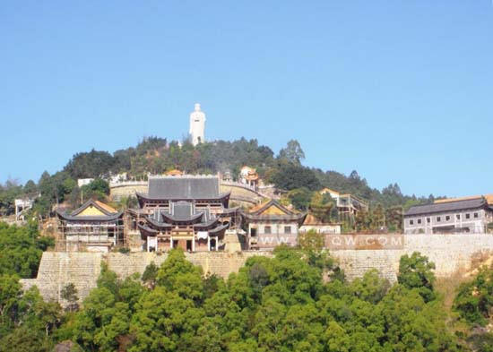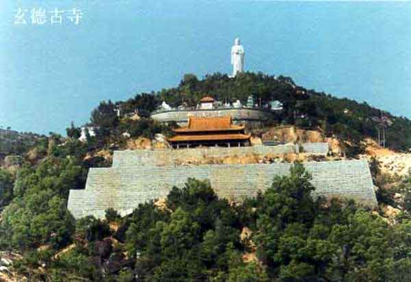 在古寺大门前阔埕,南面筑一高约10米,宽30余米的护山石壁。大埕中间,暂时安放着一尊缅甸汉白玉释加牟尼佛像,2米多高,重1.9吨,它脸容庄严慈祥,全身洁白,左手放于膝盖,右手安贴前胸,线条分明,雕艺高超。此为古寺一宝。