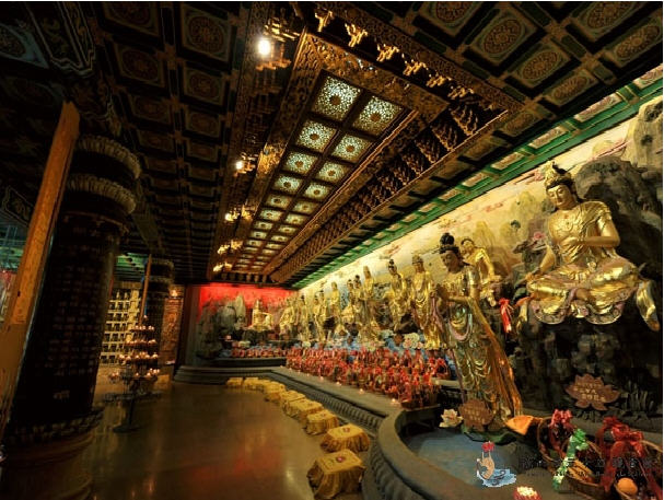 观世音菩萨三十二种应化法身,代表着人世间众多不同心愿。现三十三观音堂中,三十三尊观音应化法身群像凌立于五十米长的流动彩色水系之上,姿态各异,栩栩如生,严慈祥和,活神活现,如菩萨真身现世,利乐有情,救苦救难,普度众生!有保佑求子得子的送子观音;有金榜题名的持经观音;有从官顺利的德王观音;有身健无病的施药观音;有婚姻美满的鱼篮观音;有时时如意的六时观音;有吉祥平安的乘龙观音等。
