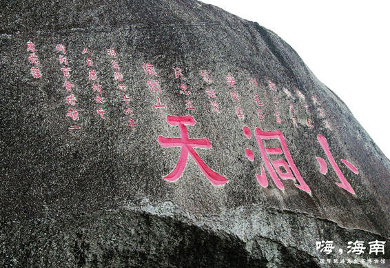 历代文人墨客无不钟情于此,题刻甚丰。风景区内至今尚留有“小洞天”、“钓台”、“海山奇观”、“仙梯”、“仙人足”、“试剑峰”等摩崖石刻,尤以毛奎所题的“小洞天”、周邝所题的“石船”为最。还有一块精致的摩崖石刻,1962年郭沫若先生来游时留下的诗词和题记。1993年4月17日,江泽民总书记在景区内题写了“碧海连天远,琼崖尽是春”的佳句,后由石工刻于景区内海滨巨石上,熠熠生辉。