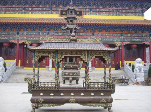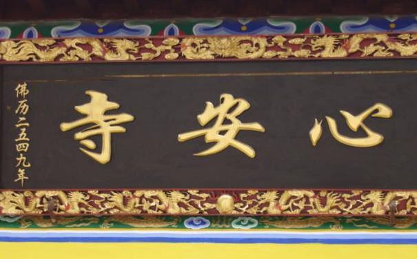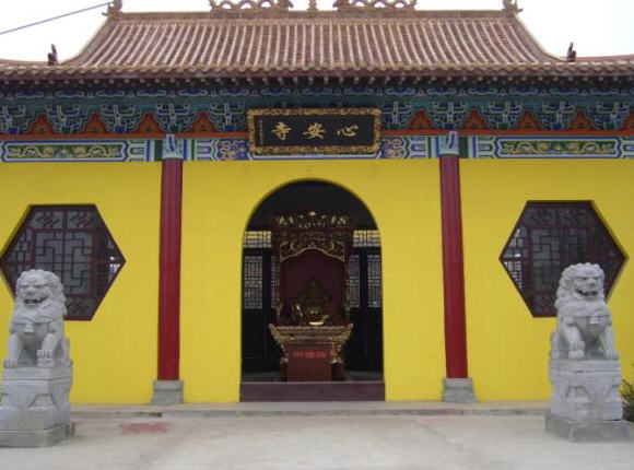是一座别具风格的寺庙,整个寺庙处于绿树环抱之中。分前殿、中殿、后院。前殿门楣高悬“心安寺”几个烫金大字,中 殿“弥驼宝殿”为主殿,十六尊罗汉分别高居于佛坛之上俯视着南来北往的香客游人。屋顶梁柱上工笔彩绘佛教故事,艳而不俗。“弥驼宝殿”后是四合院式建筑, 是众僧尼的僧房和经堂,院内回廊环绕,树木参天。整个寺院显得清洁卫生不同凡响,气势恢宏而庄重!2008年6月,被湖北省民族宗教事务委员会授予心安 寺"五好"宗教活动场所"牌匾!