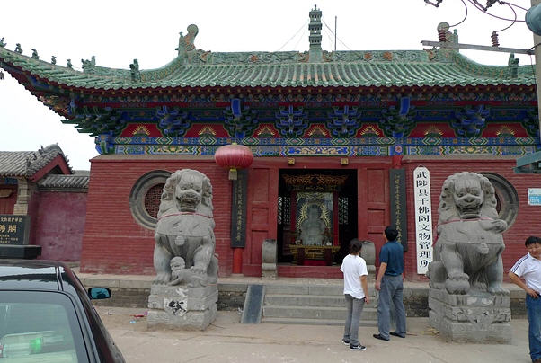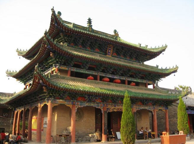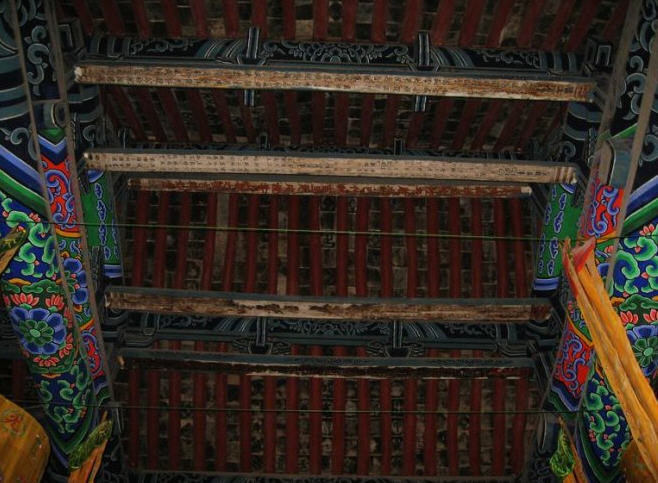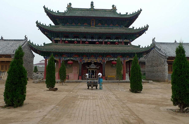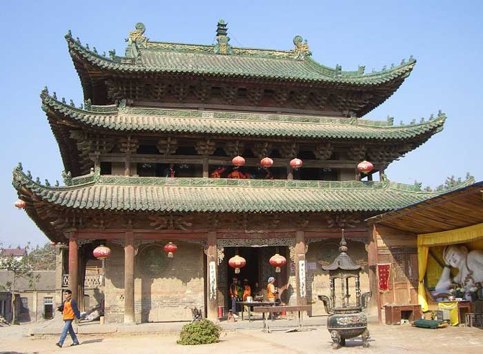 建筑群既有佛教阁殿,又有道教庙宇,是明清时释道合一的具体表现。主体建筑千佛阁、中佛殿、山门不在一条中轴线上,即“三不照”建筑,是千佛阁明显的地方特征。千佛阁为三重檐绿琉璃歇山回廊式楼阁,上层面阔三间,中下层面阔五间,进深五间。脊懔下牵杆“大明嘉靖三十六年岁次丁巳中秋吉旦郑府谨书上梁之后吉祥如意”题记为明太祖九世孙、自然科学家——朱载墒遗存墨宝。