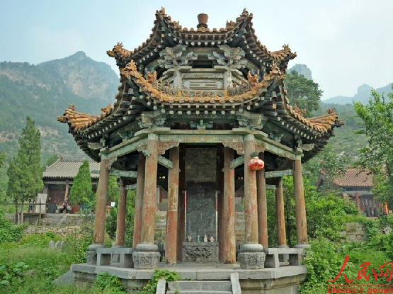 寺依山而建,为典雅玲珑的四合院落,现存古建筑有接官厅、山门、大雄宝殿、钟鼓、东西廊房等,均系清代建筑。寺系清代建筑。寺前有御碑亭,碑刻乾隆皇帝亲书的韩愈《送李愿归盘谷序》及其步韩愈韵的七言诗,书法如行云流水,洒脱而凝重。西北有明初所建的四面五层密檐式舍利砖塔。东北500米高的茶壶龛上,摩崖石刻着乾隆亲书的《盘谷考证》及“名山胜迹”四个大字。寺后谷内之盘石,宜雕砚台,用其所雕之天坛砚(亦称盘砚),为我国名砚之一。