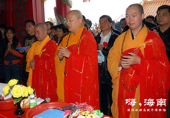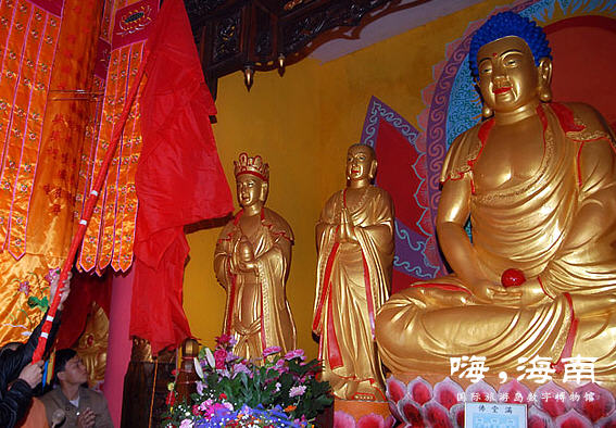 如果说,海南金山寺以其风姿奇丽深深吸引着游人;倒不如说,金寺神形各异之雕像弥弥迷魂着醉客。可不是么?刚入寺门,突见两大门神,怒睁双眼,手执兵器,威立两旁,栩栩如生。拾级而登,来到天王殿,只见大肚弥勒佛哈哈大笑,殿侧六大神将身高过丈,列嘴的,瞪眼的,举手的,挥臂的,红脸的,黑脸的;初临其境,吓怯胆小人。顺阶登顶,更是雄伟壮观金碧辉煌的如来佛大殿堂了。但见如来佛金身魁梧,金光灿灿,盘腿高坐,微笑慈祥;观其慈态,视其笑靥,令人想到,佛祖又在默默“佛光普照,济救苍生”了。