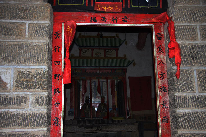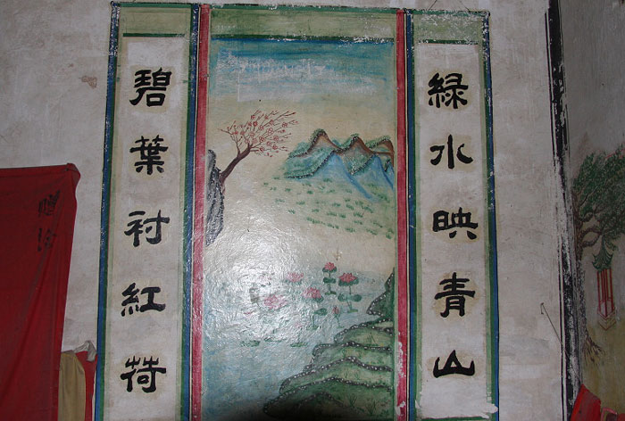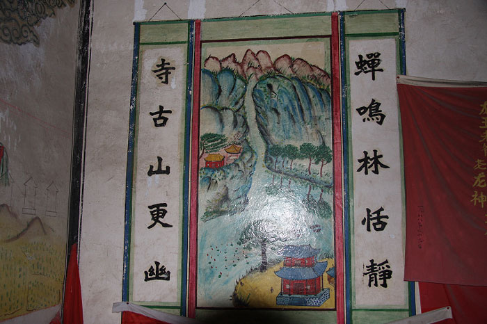 行雨宫内没有大型的雕塑,只有一个很小的神龛,内有黑龙苍龙塑像,两侧有两幅壁画,画自何时何人不知,但从魏碑字体对联看,作者书法功底很深。