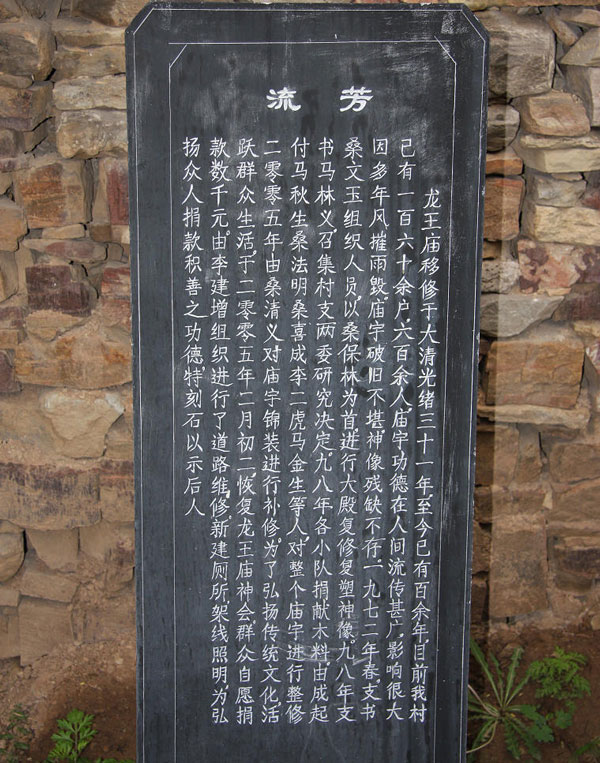 龙王庙和山里的人家一样,夜不闭户,当然白天也敞开着,使我们能来去自由,在这里停留观赏。临别,看到一块石碑,记录了支书老马带领大家修庙的事,使我又想起若干年前认识的老马。