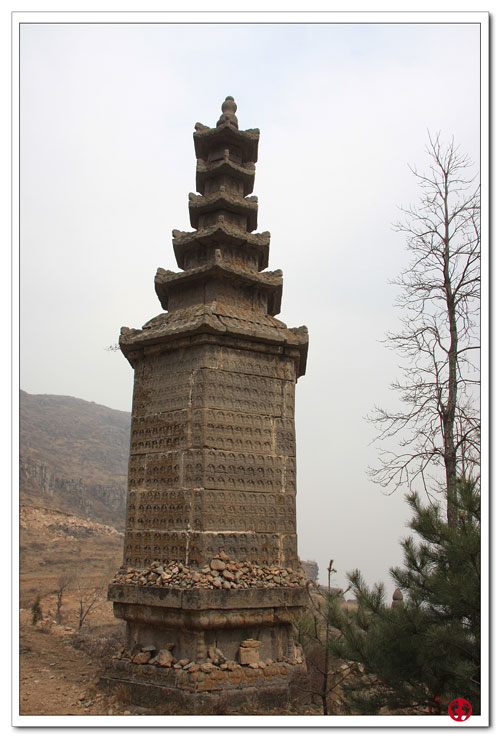 寺院外北侧有一塔林,现存明、清石墓塔46座,有方形、六角形、圆形,有覆钵式、亭阁式,有实心、空心等。其中最大为千佛塔,建于明弘治十三年(1500),青石雕造,通高10.3米,塔身平面六边形、七层,高8.8米。塔身下部一层满布浮雕佛像近千尊,上部为六角形塔檐六层,檐部平缓,翼角微翘,造型优美。