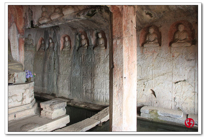 《重修林县志》名胜篇中这样介绍金灯寺:“谷(洪谷)西北一峰曰金灯峰,金灯寺在焉。下崖上岩距地三十里,凿石壁为佛殿,深广各数丈,内有井泉,水常与户阙平。”意思是说,金灯寺距离山下30里路,佛殿开凿在石壁上,里面有泉水溢出,水面和门槛齐。