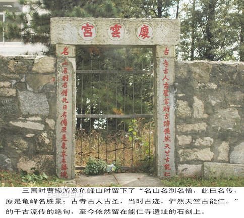 东汉建安十三年(公元208年),魏蜀吴赤壁大战,龟峰山是魏的屯粮扼地,曹操曾游览龟峰山能仁寺,并亲笔题写了“名山名刹名僧此日名传原是龟峰名胜境,古寺古人古胜当时古迹俨然天竺古能仁”千古传颂的楹联。既赞美了龟峰山仙景,又表明了佛教胜地能仁寺在当时已颇具名气。该楹联至今保存在能仁寺侧门石柱上。唐初、唐太宗李世民也曾到龟蜂山巡游、留下了“龟涎煮龟茶,天下第一家”的名句。