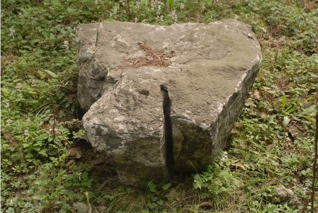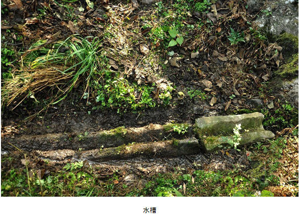 因为今年六月泉石公还和释贵明老师一起探访过甘泉寺,所以依稀记得下行的路口,大家齐心协力,来来回回走了几趟,终于找到了像有人走过的路口,大家鱼贯而下,不时从石头上跳过,在荆棘下穿行,行走中,有的人衣服挂破了,有的人手挂破了,每人身上都沾满了杂草和植物种子。待下到一个平坦的场地后,泉石公说这里原来是寺庙的农田,是支撑寺庙生存的来源,但现在树木遮天蔽日,杂草丛生,很难想像当年稻菽千层浪的景象,这时我们来到一片石头前,看到一条潮湿的水沟,原来这就是甘泉,泉水是从石缝中渗出的,至今还在滴,只不过量比较少,天长日久就形成了一个水沟,水沟上面有一段废弃的长约50厘米的石质水槽,经挖掘发现,水沟中还有一段长约70厘米的石质水槽,水沟的下面还有一个储水池,原来泉水通过石质水槽被引到下面的储水池,便于寺庙饮用。泉石公说以前泉水量很大,曾经用于灌溉农田。