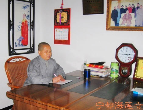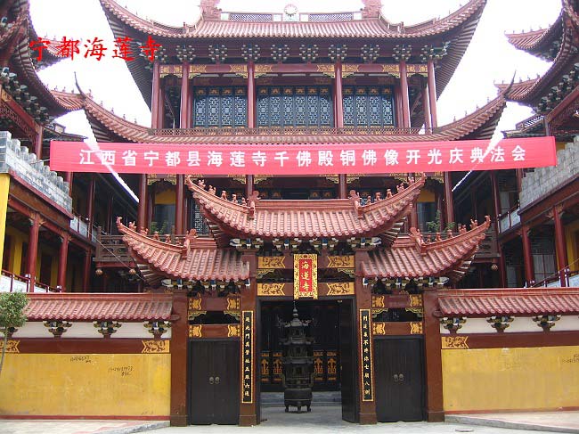 首先我寺四众弟子,一面组织正常宗教活动,一面坚信办道创业、前景广阔、艰苦奋斗、勤俭办寺、利于世人、不辞其劳、走出寺门、求助赞助。招商引资,对颓败不堪的古寺,进行全面重建,历时十年,最终从汇浙、上海、香港等地爱国居士引进赞助资金300余万元,聘请中国古典园林建筑公司,作全面规划设计。新建成了巍峨大雄宝殿,千佛楼、钟鼓楼、三圣殿、观音殿、念佛堂、斋堂、厨房、客堂、接持室、寮房、法物流通处和山门等。使得几经沧桑的古寺初具规模。同时从泰国请回玉佛六尊,从浙江请回1106尊铜佛像。从福建请回光明灯一对,为道场增光添色,重现当年风采。从300多平方和不足100万资产的“海莲寺”至今已建成2000多平方,超千万资产的“海莲寺”。并择吉于公元2002年6月1日,隆重举行了落成庆典,一座金碧辉煌,庄严肃穆,香烟缭绕,钟鼓震宇,梵声悠扬的古寺,焕发出熠熠光彩,为宁都县城新添一道亮丽的人文景现,为我县的三个文明建设作出了应有的贡献。受到了社会各界的普遍赞誉。