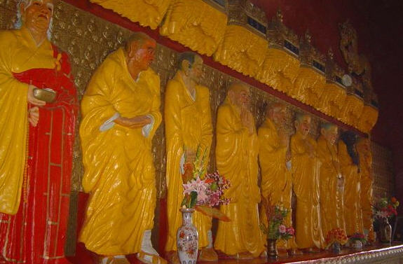与一般汉地佛寺相同的是,大殿内共塑有十八罗汉,其分布是东、西两侧各九位罗汉。罗汉全称为阿罗汉,他们是佛的得道弟子,是小乘佛教修行所获的最高果位(据说修到了罗汉的境地,就已经断尽三界烦恼,永远解脱轮回之苦)。