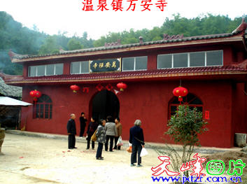 万安禅寺,座落在温泉镇石桥境内,距铜棋线公路二公里,为佛禅曹洞正宗禅庭。大师明月老禅师圆寂为此,并安葬在寺之右侧。明月大师,赣州人,生于康熙丙申(1716年),殁于乾隆甲寅(1794年),以老六祖惺能为师,亲手所建温泉镇万安禅院。老禅院距今200多年,因种种历史原因所剩无几,今之禅寺是近年来所重建。