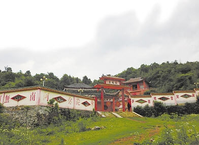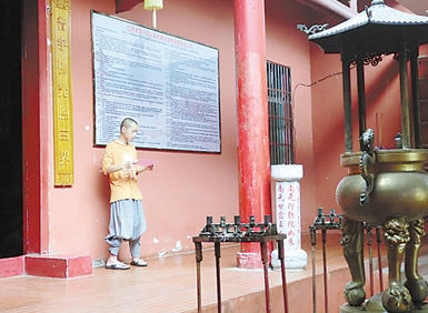 因天龙寺建于深山之中,往来香客很少,显得非常清静。寺庙中仅有两位20多岁的小和尚在此修行,寺庙门口还摆放了若干双拖鞋,笔者一行换上拖鞋,进到寺来,看见里面可以称得上是一尘不染,干净非凡。寺庙里的两位小师傅正在专心地修行,一位正对着普庵禅师修行的祖师洞在专心地练着瑜伽术,一位站在普庵殿门口念《普庵咒》,两人都非常专心致志,对笔者一行的到来视若无睹,笔者一行也不去打扰他们,自己在寺庙里到处走走看看。